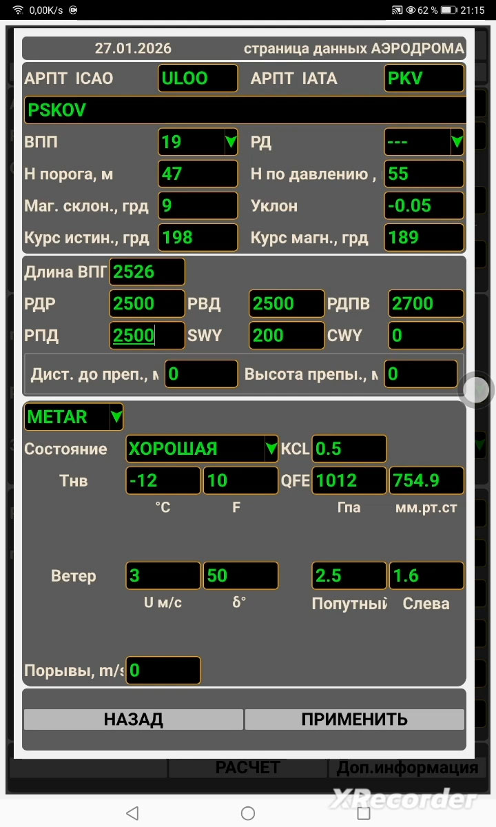 расчет максимальной посадочной массы для конкретных и прогнозируемых условий на аэродроме, выбранном из базы данных;